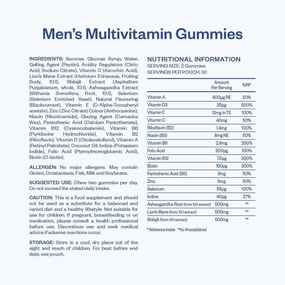 Sucrose, Glucose Syrup, Water, Gelling Agent (Pectin), Acidity Regulators (Citric Acid, Sodium Citrate), Vitamin C (Ascorbic Acid), Lion’s Mane Extract (Hricium Erinaceus, Fruiting Body, 10:1), Shilajit Extract (Asphaltum Punjabianum, whole, 10:1), Ashwagandha Extract (Withania Somnifera, Root, 10:1), Selenium (Selenium Enriched Yeast), Natural Flavouring (Blackcurrant), Vitamin E (D-Alpha-Tocopheryl acetate), Zinc (Zinc Citrate) Colour (Anthocyanins), Niacin (Nicotinamide), Glazing Agent (Carnauba Wax), Pantothenic Acid (Calcium Pantothenate), Vitamin B12 (Cyanocobalamin), Vitamin B6 (Pyridoxine Hydrochloride), Vitamin B2 (Riboflavin), Vitamin D Oil (Cholecalciferol), Vitamin A (Retinyl Palmitate), Coconut Oil, Iodine (Potassium Iodide), Folic Acid (Pteroylmonoglutamic Acid), Biotin (D-biotin).