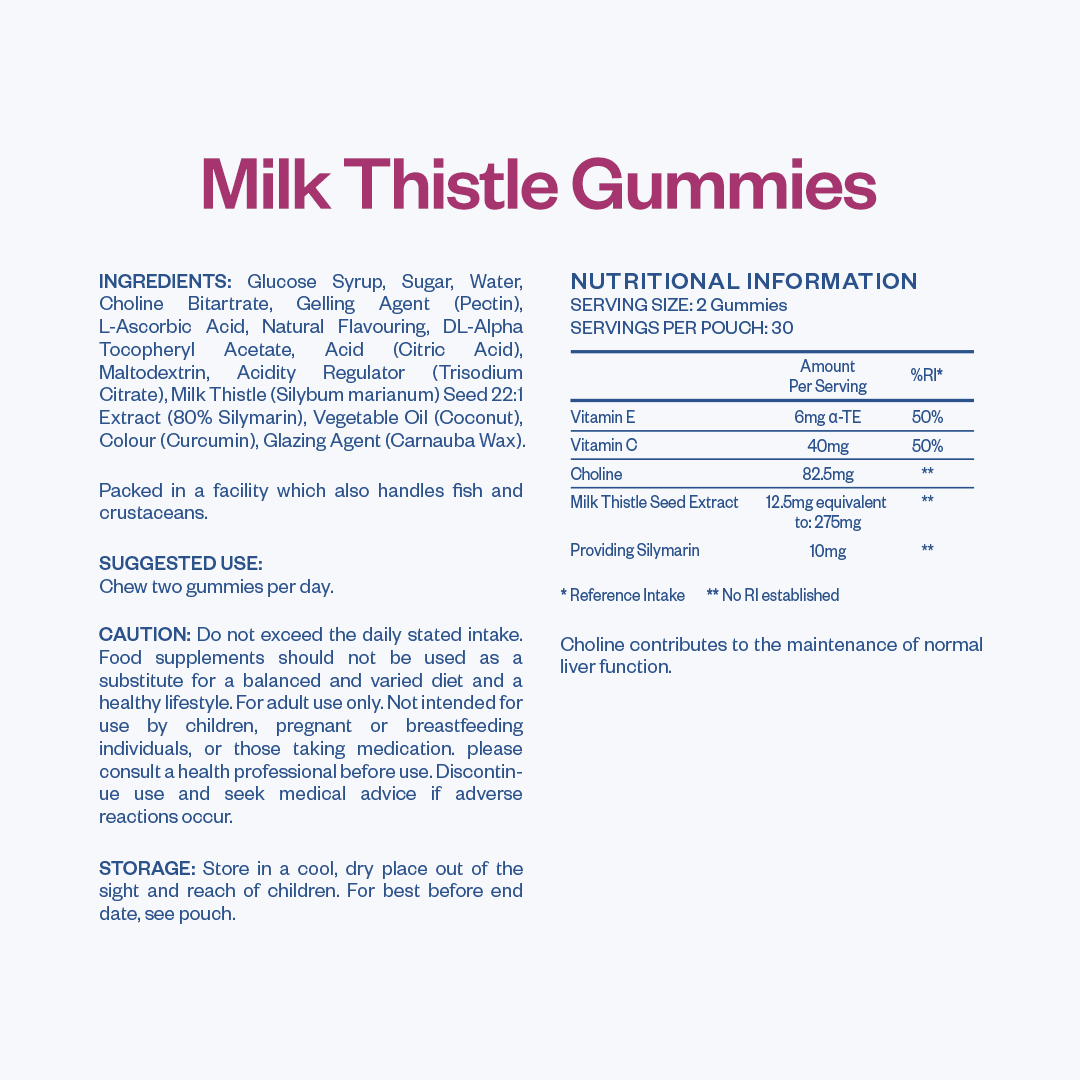 Glucose Syrup, Sugar, Water, Choline Bitartrate, Gelling Agent (Pectin), L-Ascorbic Acid, Natural Flavouring, DL-Alpha Tocopheryl Acetate, Acid (Citric Acid), Maltodextrin, Acidity Regulator (Trisodium Citrate), Milk Thistle (Silybum marianum) Seed 22:1 Extract (80% Silymarin), Vegetable Oil (Coconut), Colour (Curcumin), Glazing Agent (Carnauba Wax).