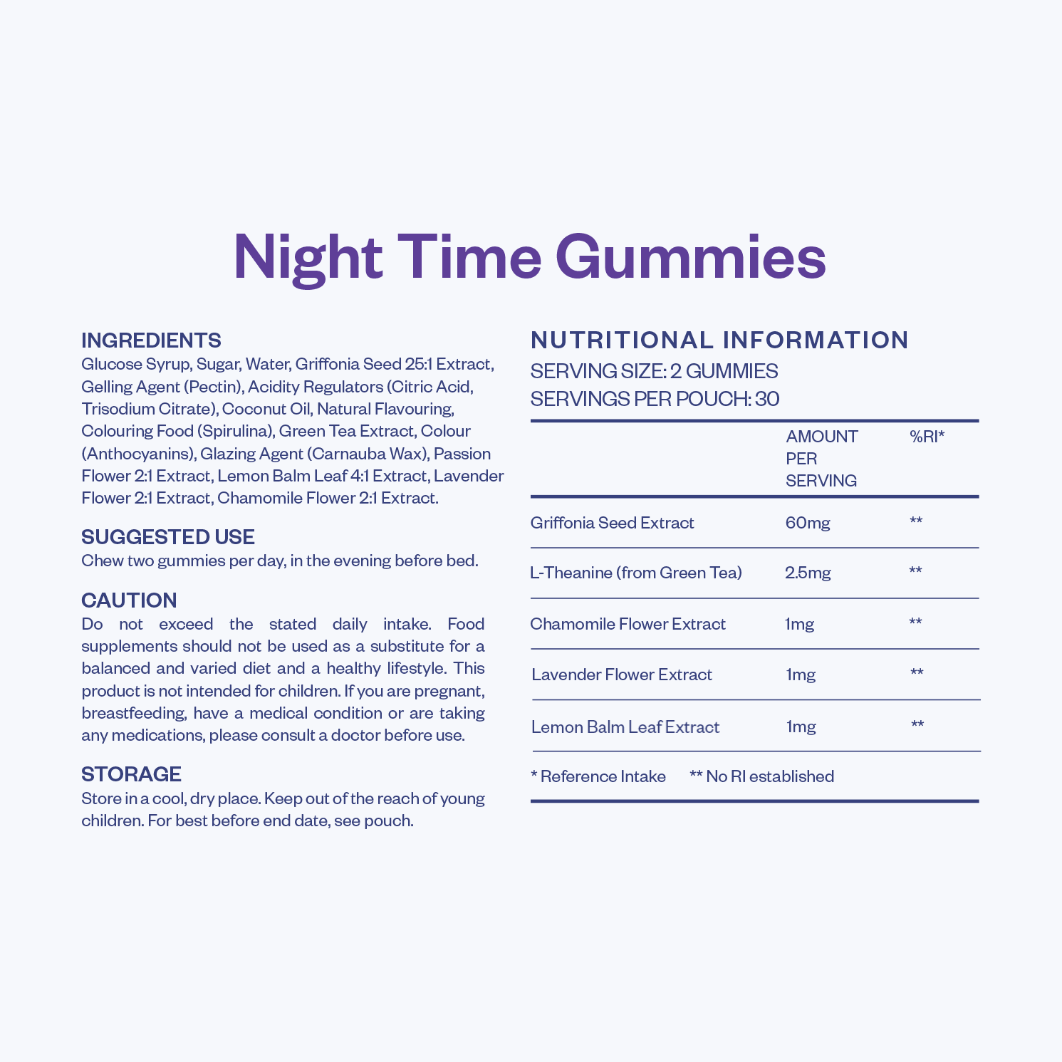Supporting your sleep routine has never been quicker. Night Time Gummies combine a calming blend of Griffonia Seed (5-HTP), L-Theanine, Lavender, Chamomile, and Lemon Balm to help you ease into a peaceful evening.